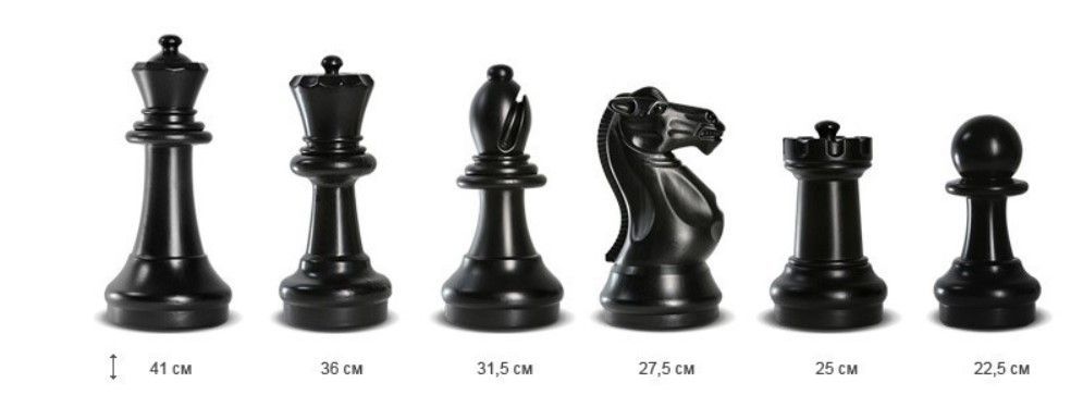 пешка, высота — 215 мм;, ладья, высота — 235 мм;, конь, высота — 270 мм;, слон, высота — 310 мм;, ферзь, высота — 350 мм;, король, высота — 405 мм