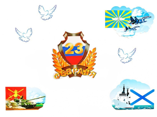 - объемная эмблема с флагом Российской Федерации и надписью 23 февраля, размеры (ШхВ) — 1200х1300 мм — 1 шт.;