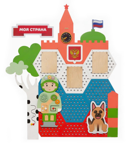Поверхность панелей перфорирована. Бизиборды имеют подвижные элементы, которые позволяют тренировать мелкую моторику. Панель помогает запомнить государственную символику, цвета, усвоить понятия малой и большой Родины.