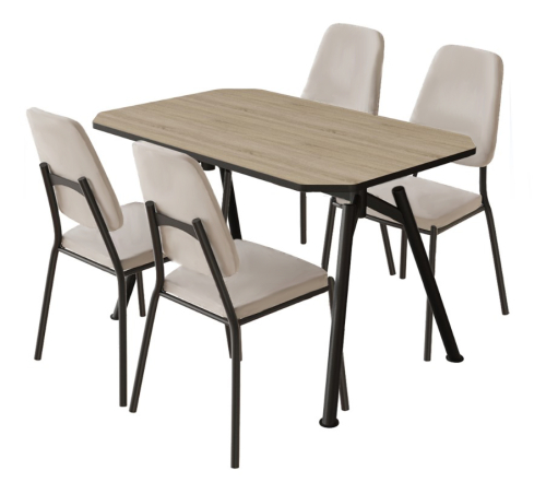 Обеденная группа состоит из стола и четырех стульев с мягкими сиденьями и спинками. Столешница облицована пластиковой кромкой. Острые углы скруглены.