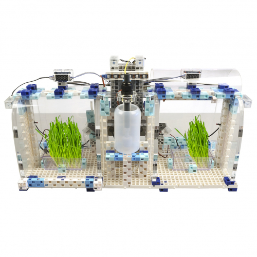 Набор-конструктор позволяет создать теплицу для выращивания растений. Она состоит из 2-х отсеков с емкостями, датчиками и подсветкой. Автоматически отслеживаются основные показатели: влажность почвы, уровень воды, температура. Полив автоматический. Пользователь наблюдает за процессами через пленку, которая откидывается для доступа к растениям.