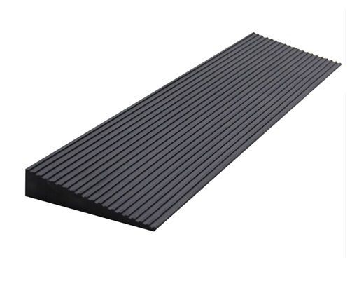 Пандус из переработанной резины подходит для улиц и помещений. Поставляется в черном цвете. Не скользит, монтажа не требует. По ширине соответствует нормативам. Грузоподъемность составляет 750 кг. Осадки и грязь уходят по каналам рифленой поверхности.
