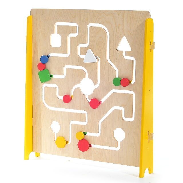 Отшлифованная панель на боковых опорах представляет собой поле с лабиринтом. Элементы разных форм и цветов можно передвигать по желобам, сортировать. Кистевой тренажер подходит детям с ОВЗ.