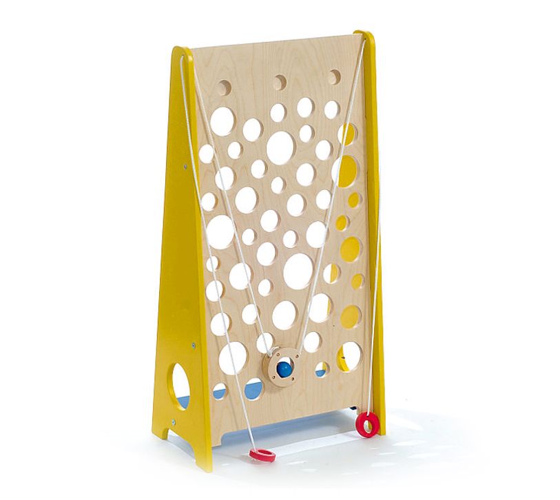 Вертикальная панель с отверстиями представлена в виде ломтика сыра. Перед ней висят круглые элементы на ниточках: 2 боковых кольца, за которые нужно тянуть, и одно центральное (с шариком в середине), которое перемещается при натяжении веревки. Победителем становится тот, чей шарик добрался до верха, не свалившись в лунку.