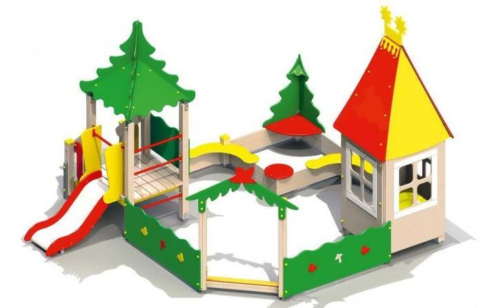 Элементы оформлены в едином стиле. Накладной декор (ели, бабочки, птицы, ветви) соответствует лесной тематике. Крыша домика с окнами украшена звездочками. Детали не выцветают на солнце.