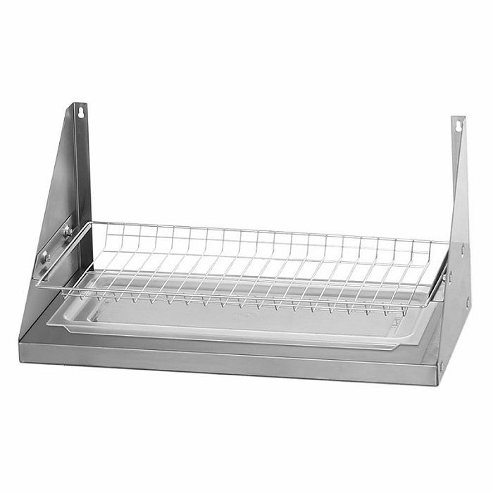 Металлическая полка с поддоном используется для сушки тарелок или стаканов. Каркас разборный (толщина 0,8 мм), основание имеет безопасные гибы. В наличии отверстия для монтажа к стене и метизы. Изделие не подвержено коррозии либо ржавчине. Для сушки посуда закрепляется в сетке с индивидуальными отделениями.