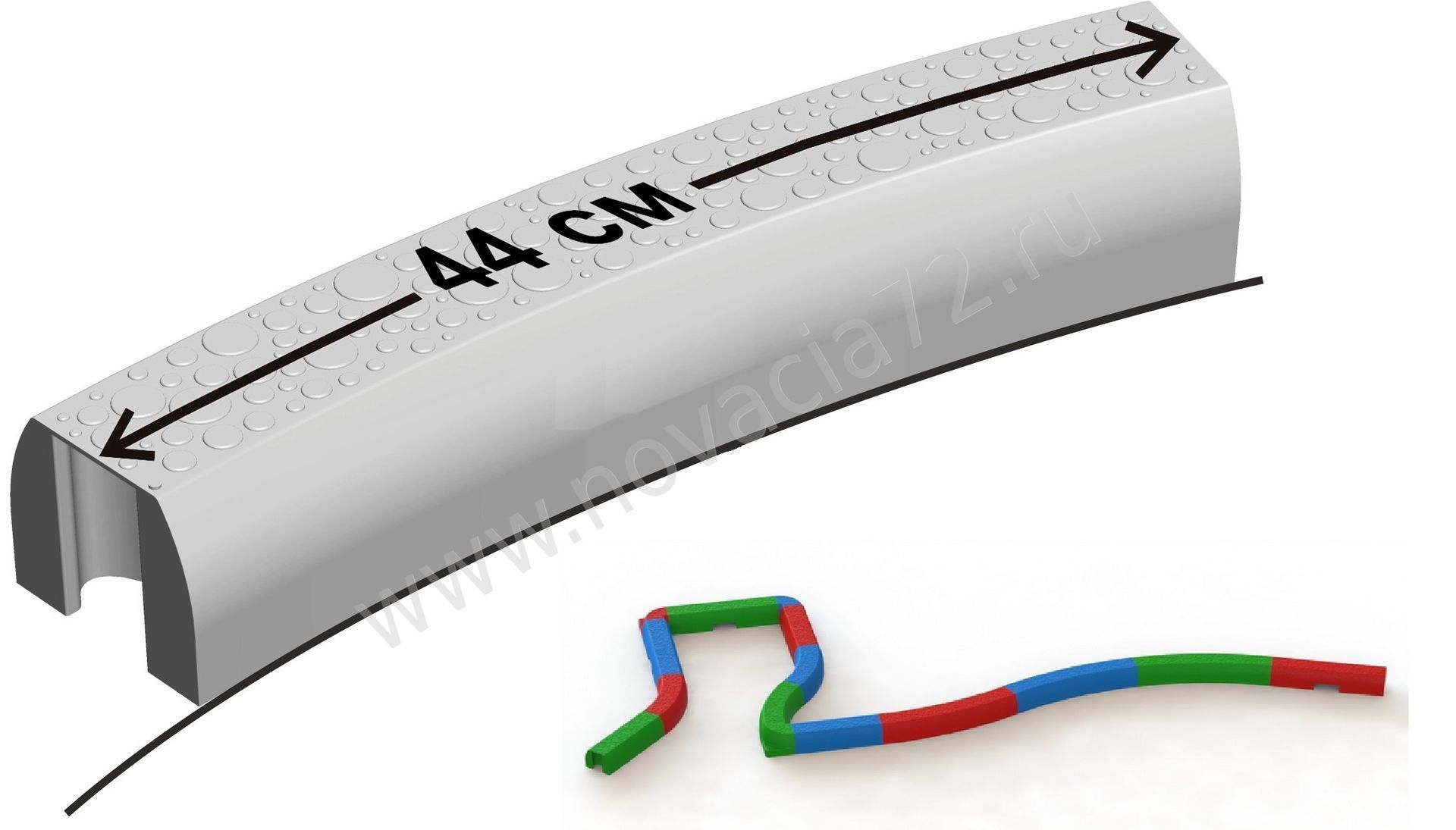 Большой поворот представляет собой продолговатую деталь с прямоугольной верхней гранью (длина  44 см, массажная поверхность) и  дугообразным профилем. Из  таких блоков составляется готовое решение для бордюров, которое  помогает  младшим школьникам и дошкольникам укрепить вестибулярный аппарат, избавиться от страха высоты. Занятия направлены формирование правильной осанки и предотвращение плоскостопия.