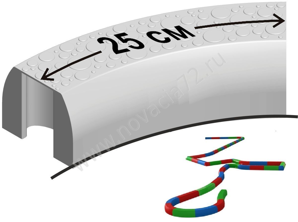 Элемент служит для построения балансировочной дорожки, которая может иметь скругления и изгибы. Малый поворот (продолговатая деталь с прямоугольной верхней гранью и дугообразным профилем) оснащен специальными боковыми пазами, образующими длинную платформу, готовое решение для бордюра.