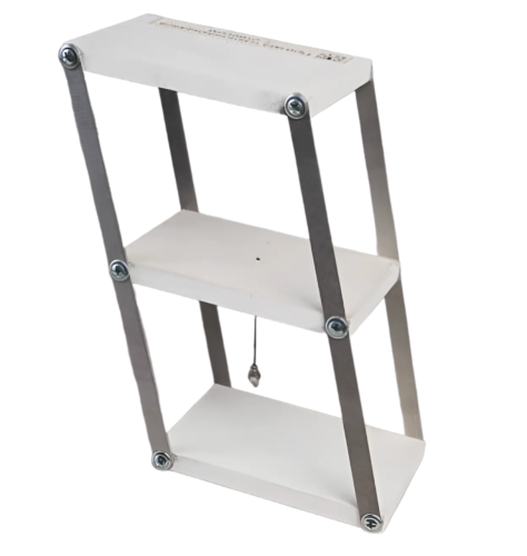 Призма состоит из 3-х прямоугольных пластин, подвижно соединенных по углам рейками. Представляет собой модель однородного тела с меняющейся формой. В центре тяжести имеется отвес.