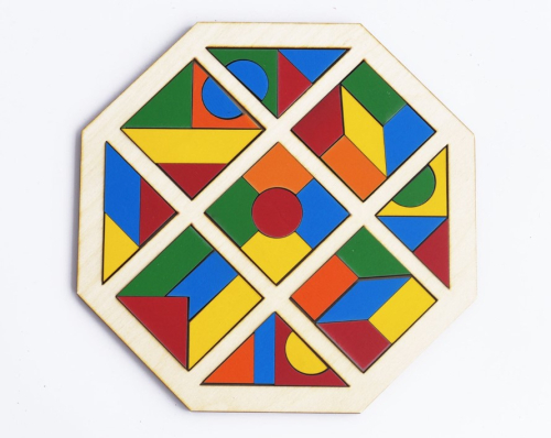 Дидактический материал представлен в виде цветной мозаики. Развивает моторику и мышление (в том числе, у детей с ОВЗ: нарушениями опорно-двигательных функций, ДЦП, РАС и проч.). Рамка с пустотами заполняется сочетанием фигур.