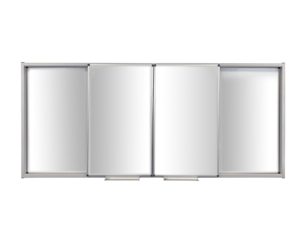 Оборудование для класса представлено досками для записей и проекции. На металлокаркасе с рельсами закрепляется ряд из 3-х статичных рабочих поверхностей. Перед ними монтируются раздвижные доски: по 2 шт. в 1-2 ряда, в зависимости от конфигурации. Эти поля отводятся в сторону бесшумно. На центральную часть можно передавать изображения с короткофокусного проектора (в комплект не входит).