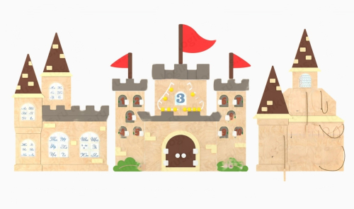 Настенная панель выполнена в виде замка. Изготовлена из гипоаллергенных материалов. На поверхности расположены окошки с цифрами и буквами русского алфавита.