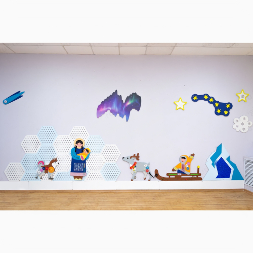 Панель выполнена в тематике традиций и быта народов крайнего Севера. Элементы крепятся по отдельности и свободно комбинируются между собой. На панели есть развивающие элементы: бегунки, шестеренки, лабиринты.