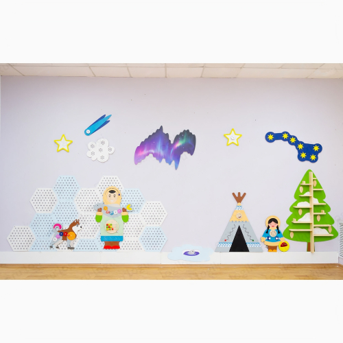 Панель выполнена в тематике традиций народов крайнего Севера и включает детали в виде северного сияния, юрты, ездовой собаки и пр. Элементы крепятся по отдельности и свободно комбинируются между собой. На панели есть развивающие элементы: бегунки, шестеренки, лабиринты.