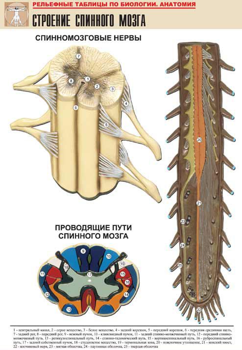 На белом фоне показано строение спинного мозга человека (с проводящими путями и нервами на отдельных фрагментах). Элементы рисунка обозначаются разными цветами, сопровождаются поясняющей информацией. Таблица для уроков биологии (анатомии) покрыта матовой пленкой с объемным эффектом, исключающим блики. Рисунок с полноцветной печатью выглядит рельефным.