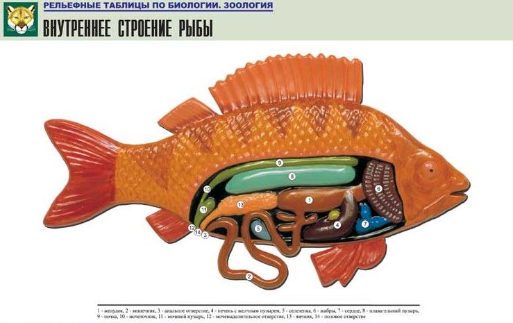 Строение рыбы представлено в продольном разрезе, на белом фоне. Элементы рисунка выделены цветом и сопровождаются поясняющей информацией. Плакат для кабинета биологии (зоологии) ламинируется матовой пленкой без бликов, с объемным эффектом.