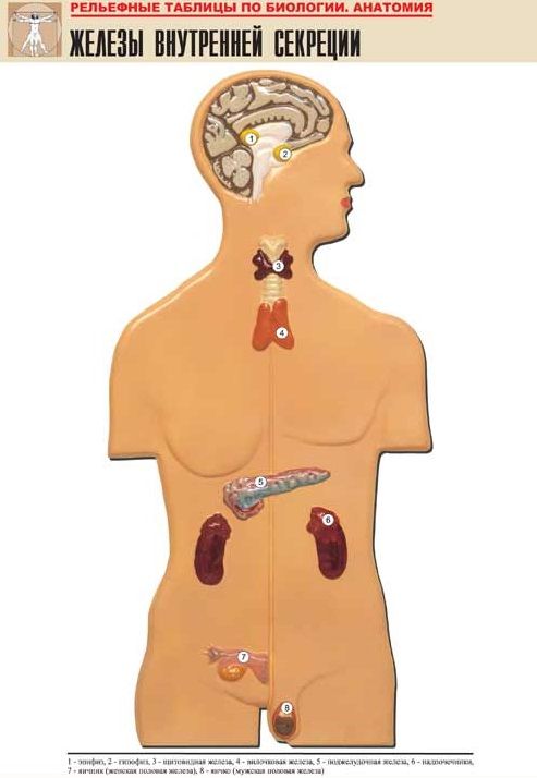 На белом фоне схематически изображен фрагмент тела человека с обозначением желез внутренней секреции. Таблица для уроков биологии (анатомии) покрыта матовой пленкой с объемным эффектом, исключающим блики. Элементы рисунка выделены разными цветами, сопровождаются поясняющей информацией. Благодаря специальной полноцветной печати рисунок выглядит рельефным.