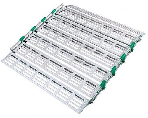 Конструкцию окружают заметные бортики из пластика. Рабочая поверхность с нескользящими ребрами выдерживает 500 кг. Ширина позволяет пропускать детские коляски, инвалидные кресла.