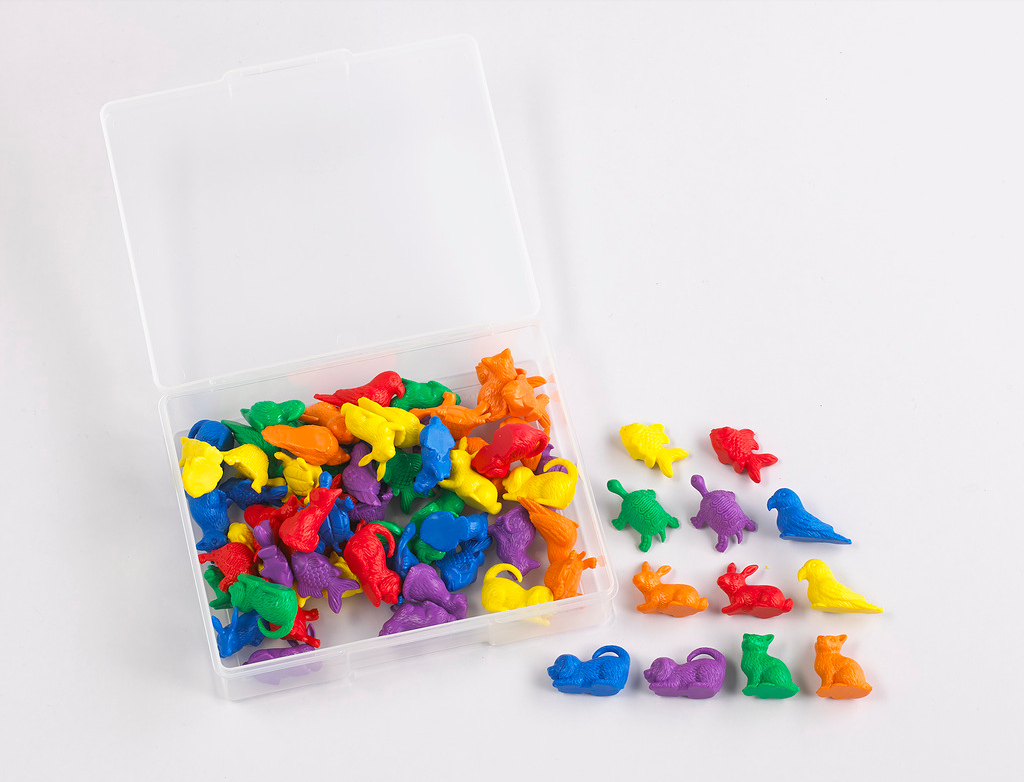 Счетный набор включает в себя 72 разноцветные фигурки наиболее распространенных домашних животных: попугай, кошка, собака, кролик, рыбка, черепаха (длина каждой фигурки около 3,5 см).