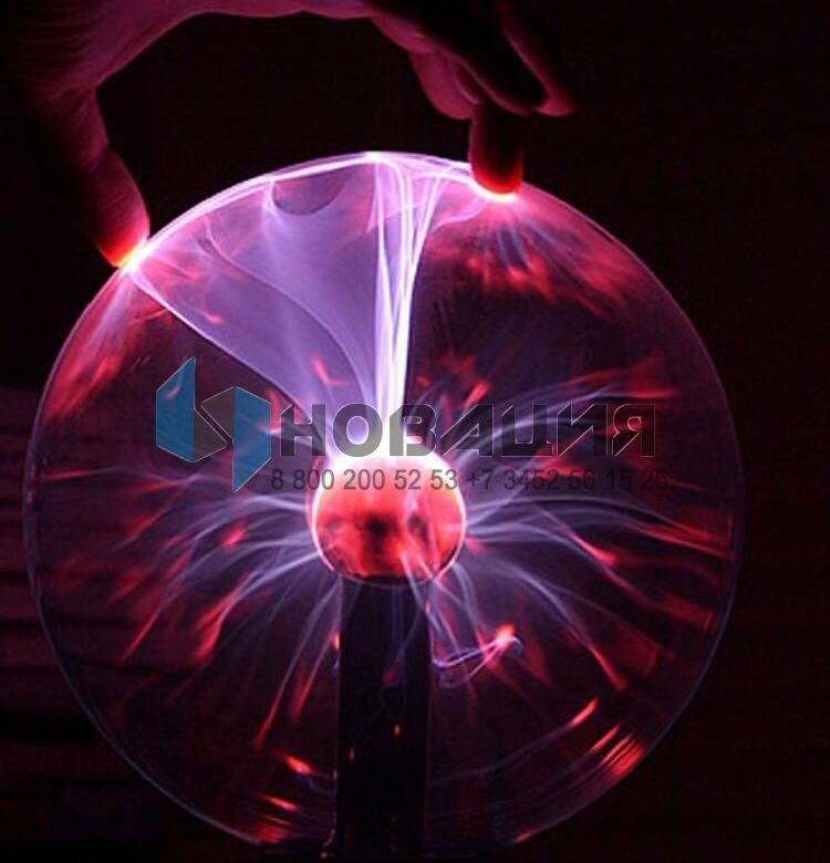 Декоративный светильник на подставке, с лампой круглой формы, с визуальными эффектами, имитирующими разряды молнии, выглядит аккуратно и эстетично.