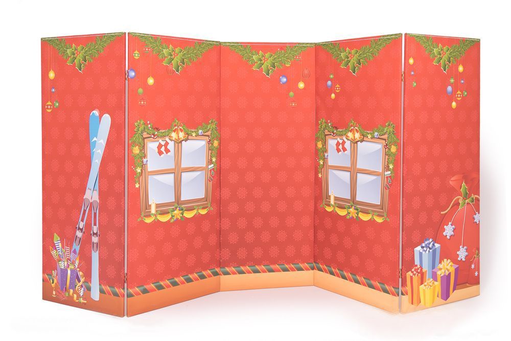 Нейтральный фон в виде стен с окнами, лыж и подарков подойдет для тематического мероприятия. Створки в количестве 5 шт. при необходимости снимаются. Складная конструкция легко устанавливается, занимает минимальную площадь при хранении.