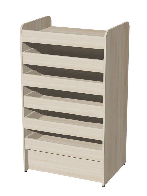 Прямой фасад с цоколем оснащается 5-ю выдвижными отделениями с бортиками. Содержимое каждого ящика частично открыто для читателя. Поверхность топа используется для выставки экземпляров и работы с газетами.