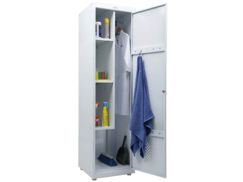 Шкаф предназначен для хранения рабочей одежды и инвентаря. Состоит из вертикальной перегородки, 3 полок, держателя, крючков для одежды, перекладины для плечиков. Оснащен ключевым замком с возможностью смены цилиндра.