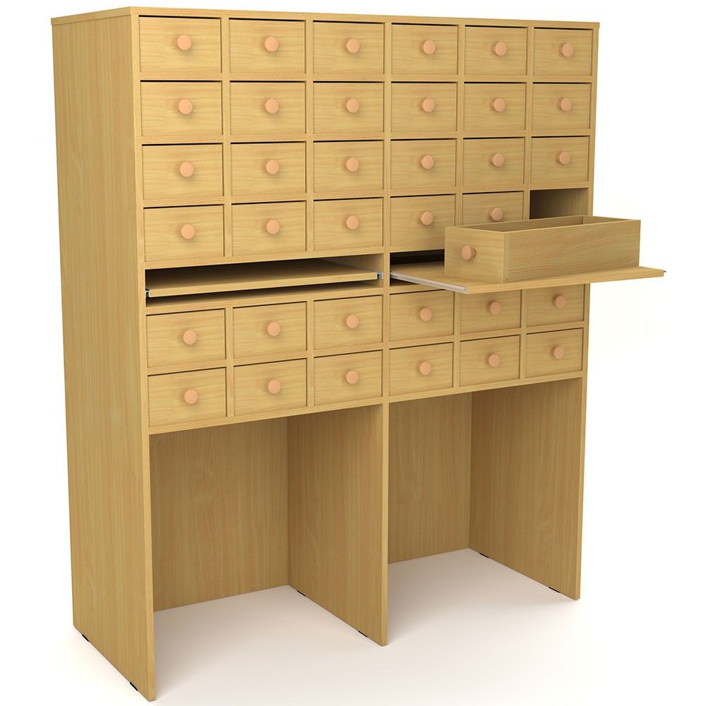 Высота расположения полок и деревянных ящиков позволяет работать с картотекой в комфортных условиях.