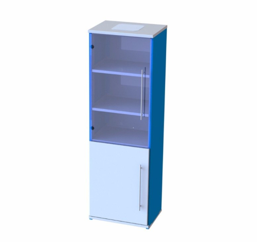 Размещается на опорах с ходом регулировки 60 мм, которые оснащены круглыми пластиковыми подошвами. В шкафу располагаются 1 жестко закрепленная полка и 3 регулируемые полки. Дверцы оснащены декоративными алюминиевыми ручками. Верхняя дверца выполнена из стекла, нижняя — из металла и имеет встроенные замки.