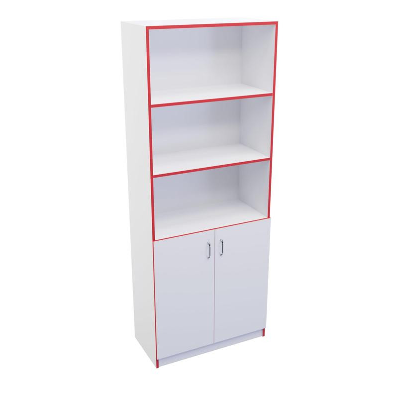 Мебель оснащается 4-мя полками (съемная нижняя полка скрыта за фасадами). Задние стенки выполняются из ХДФ. Изделие поставляется в белом цвете, кромки на лицевой стороне красные. Возможно изготовление мебели по индивидуальному заказу.