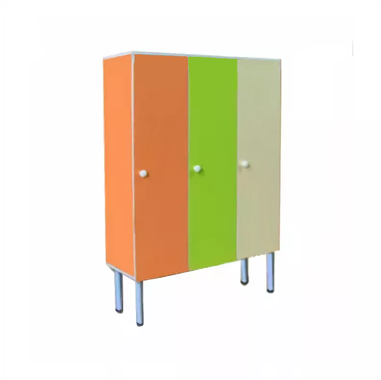 Детский трехсекционный шкафчик с закругленной наверху дверцей  размещается в ДОУ. Это аккуратная и яркая мебель, позволяющая хранить предметы гардероба. Имеет 2 решетчатые полки внизу, вверху полку из ЛДСП (для головного убора);  каркас шкафа металлический. Высота опор позволяет задвигать под шкафчик скамейку — для экономии места.