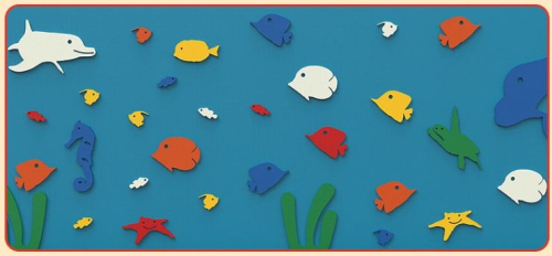 Скалодром состоит из трех секций размером 900х2000 мм. Каждая секция включает две панели. Упоры выполнены в виде рыб и морских животных. Крепления входят в комплект, допустимая нагрузка на скалодром 500 кг.