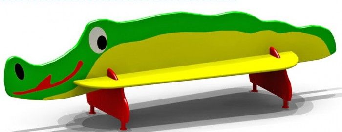 Скамейка с 2-мя сиденьями подходит для отдыха на улице. Художественно оформленная перегородка выполнена в виде крокодила. Элементы с закругленными углами соединяются при помощи пазов. Опоры дополнены металлическими подпятниками.