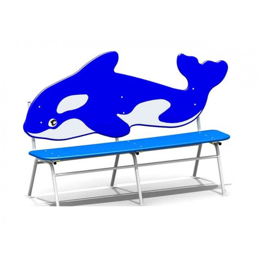 Детская скамейка с фигурной спинкой в форме касатки опирается на П-образные ножки (3 шт.). Каркас выполнен из труб, d 21-26 мм. Опоры усилены перекладинами.