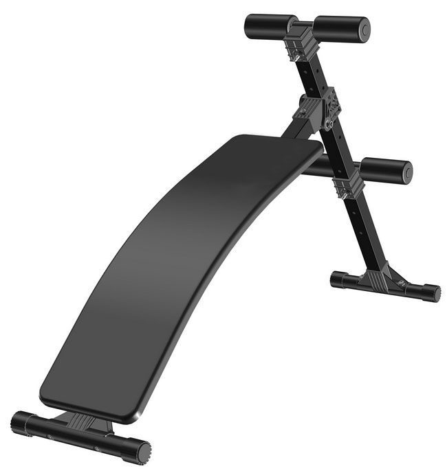 Инвентарь оснащается валиками для закрепления ступней ног. Торцевые опоры подстраиваются под неровности пола. Угол наклона тренажера изменяется в пределах: 15, 25, 35 градусов.