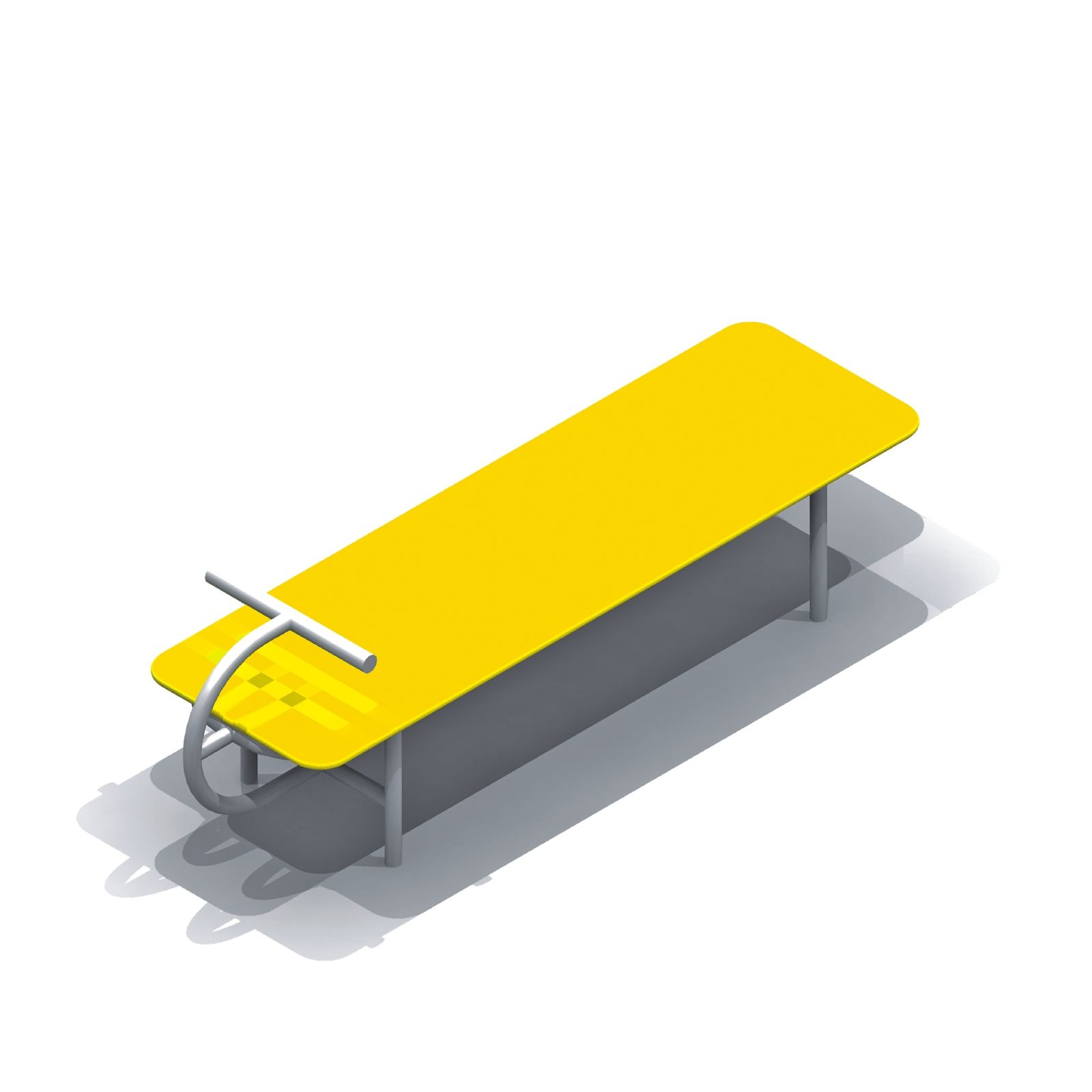 На металлический каркас из профильной трубы устанавливается влагостойкий фанерный настил со скругленными углами, приваривается упор. При подъеме и опускания туловища ноги подростка фиксируются упором.