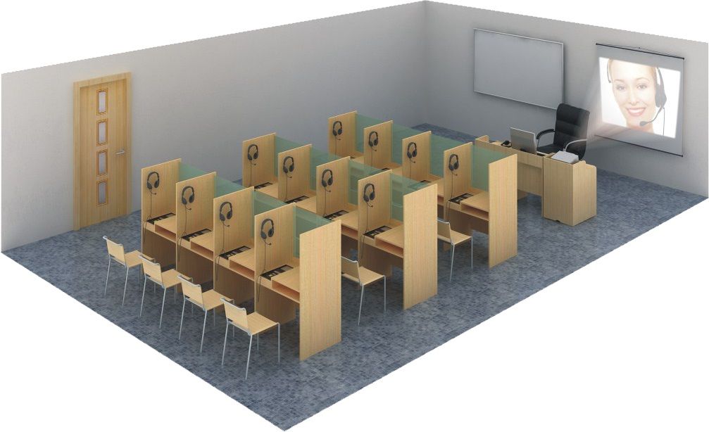 Педагог управляет процессом со своего рабочего места. ПО с удобным интерфейсом помогает настроить показ видео, DVD или графических файлов. Звук подается в гарнитуру каждого ученика. Доступны функции проговаривания и самопрослушивания. Школьник отвечает на вопросы преподавателя, участвует в групповой работе.