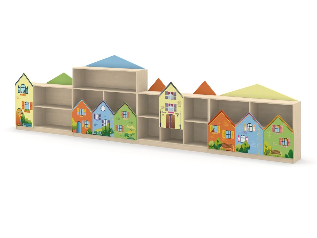 Стеллаж для игрушек и пособий декорирован изображениями городских домов. 4 секции состоят из верхних и нижних отделений полуоткрытого и закрытого типа. Вместительные полки комплектуются резными дверцами. Топ служит дополнительной поверхностью для хранения.