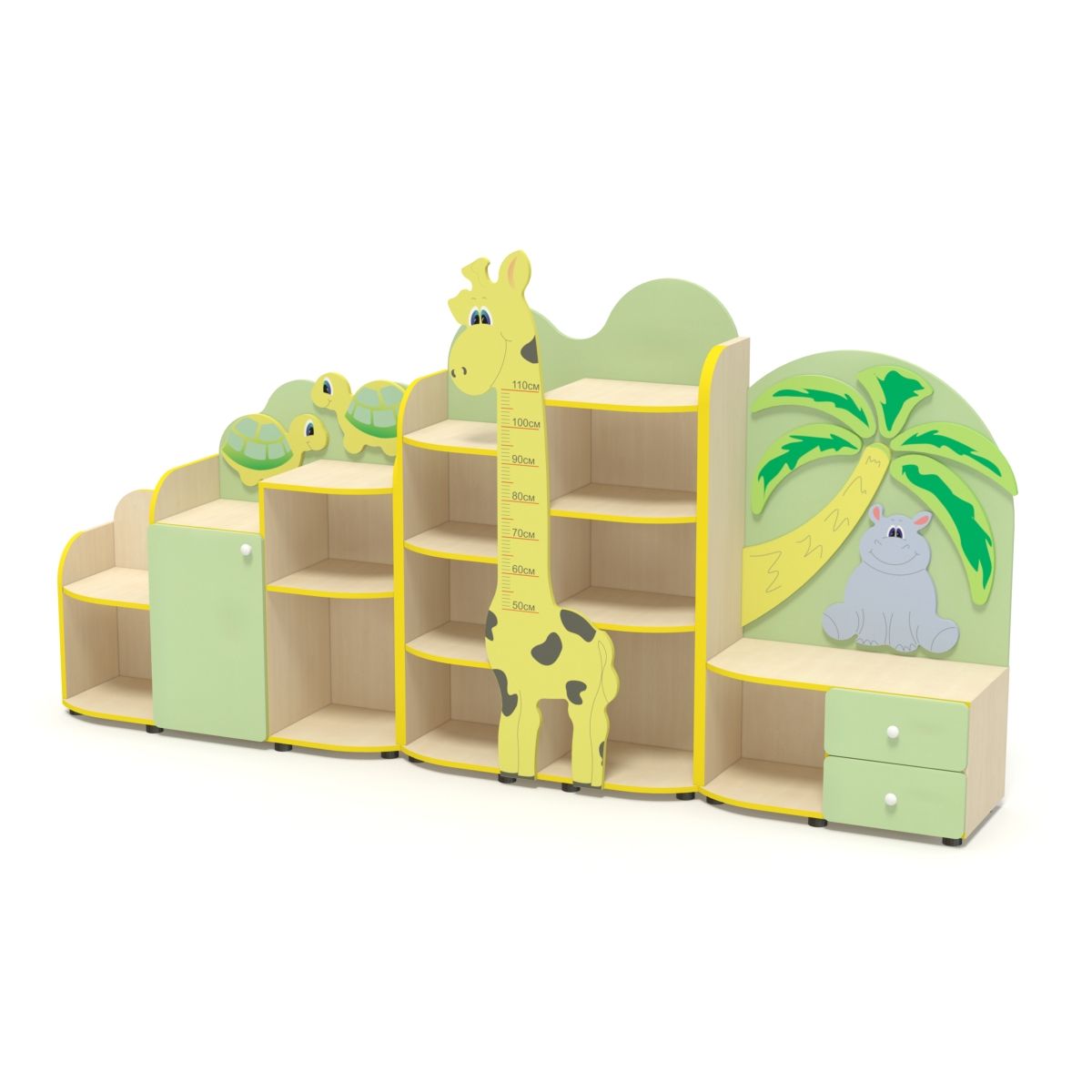 Стенка для хранения игрушек и книг украшена изображениями тропических животных, пальмы. На лицевой стороне закрепляется ростомер в виде жирафа.