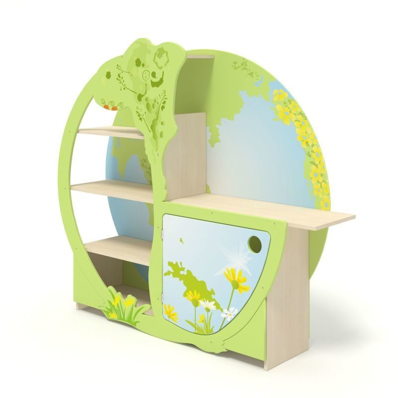 Стеллаж с изображением Земли позволяет организовать живой уголок или мини-библиотеку с выставкой. В одной части шкафа 5 полок за фигурной стенкой с отверстием, в другой-тумба с резной дверцей и столешница. Прямоугольная рабочая поверхность выступает за пределы тумбы.