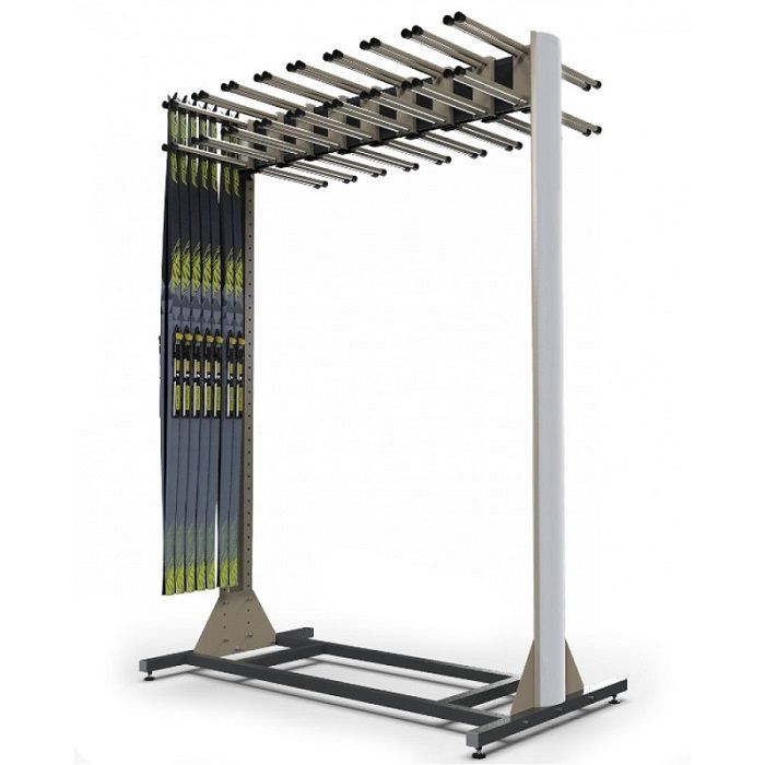 В 2-стороннем стеллаже для школы хранятся беговые лыжи. Спортивный инвентарь складывается скользящей поверхностью внутрь и фиксируется посредством держателей. Одна вешалка-вилка из стальной трубы выдерживает 7 пар лыж.