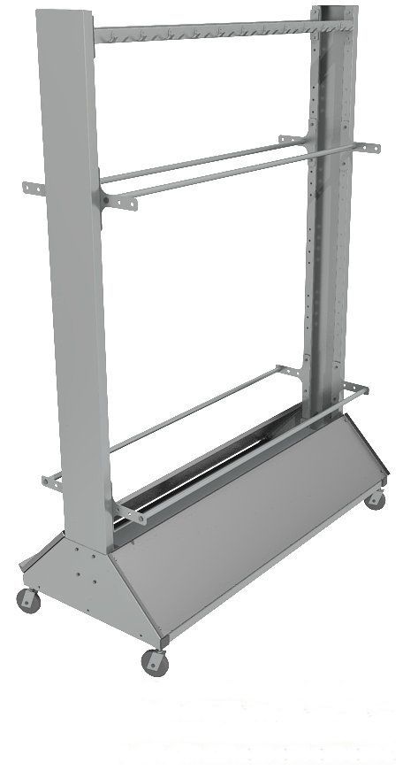 Прочное основание в форме пирамиды с бортиками оснащается 4-мя колесами, благодаря которым стойка быстро сдвигается и поворачивается. Боковые панели из металла соединяются сдвоенными горизонтальными перекладинами. Верхние перекладины оборудуются крючками для лыжных палок.