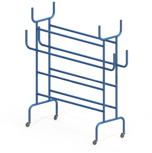 Стеллаж состоит из 3-х уровней (полочек), предназначенных для хранения разного вида мячей. Для подвешивания канатов и обручей по бокам конструкции представлены 8 крючков (по 4 с каждой стороны). Для облегчения передвижения стеллаж установлен на 4 поворотных колеса.
