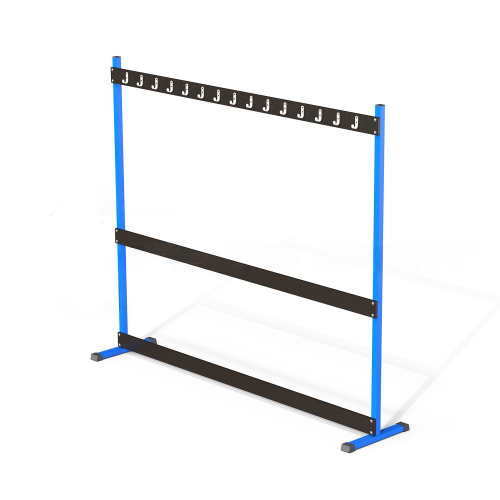Металлический каркас выполняется из трубы прямоугольного сечения. Боковые стойки соединяются поперечными перекладинами из фанеры. Верхняя перекладина оснащается металлическими крючками для закрепления лыжных палок.