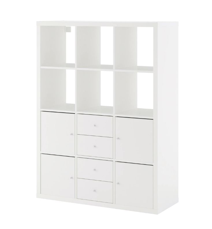 Шкаф состоит из 6-ти полуоткрытых отделений, 4-х вставок с дверцами и 2-х вставок с парами ящиков. Полки рассчитаны на максимальный вес в 13 кг. Шурупы, дюбели, саморезы приобретаются отдельно. Навесы для крепления к стене есть в наборе.
