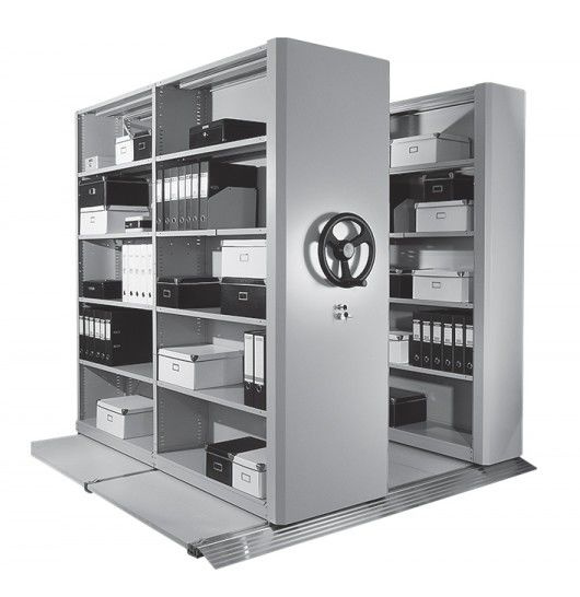 Архивный шкаф для школы или информационно-библиотечного центра управляется штурвалом со складной ручкой. Секция на колесах движется по рельсам без опрокидываний, в наличии стопор и замок. Книги и документы доставляются пользователю без задержки.