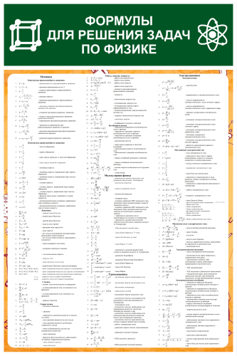 Стенд содержит формулы, которые используются для решения задач в различных разделах физики. Может использоваться как подсказка во время проведения уроков.