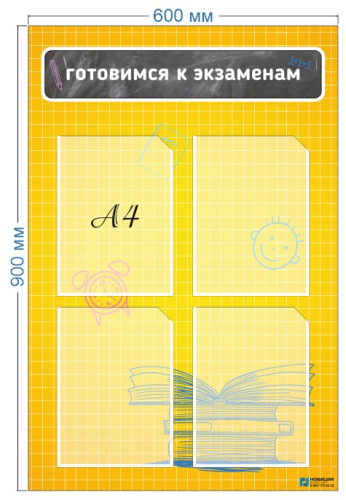 На выбор предоставляется несколько вариантов оформления. На стенде есть четыре специальных кармана A4. В них можно поместить всю информацию о подготовке к экзаменам.