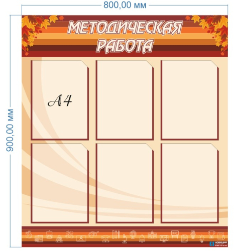 Стенд выполнен в бежево-коричневой гамме. Использование стенда позволит сделать всю необходимую информацию по методической работе доступной как учащимся, так и учителям. Информационные листы можно расположить в вертикальных карманах формата А4, которые крепятся на двусторонний скотч.