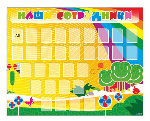 Стенд «Наши сотрудники» поможет познакомить родителей малышей с коллективом детского сада. Для размещения фотографий воспитателей, педагогов и сотрудников на стенде есть 31 карман размером 10х15 см.